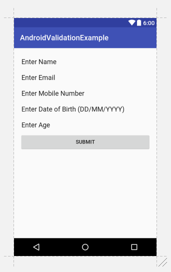 <?xml version="1.0" encoding="utf-8"?> <LinearLayout xmlns:android="http://schemas.android.com/apk/res/android" xmlns:tools="http://schemas.android.com/tools" android:id="@+id/activity_main" android:layout_width="match_parent" android:layout_height="match_parent" android:orientation="vertical" android:paddingBottom="@dimen/activity_vertical_margin" android:paddingLeft="@dimen/activity_horizontal_margin" android:paddingRight="@dimen/activity_horizontal_margin" android:paddingTop="@dimen/activity_vertical_margin" tools:context="net.simplifiedcoding.androidvalidationexample.MainActivity"> <EditText android:id="@+id/editTextName" android:layout_width="match_parent" android:layout_height="wrap_content" android:ems="10" android:hint="Enter Name" android:inputType="textPersonName" /> <EditText android:id="@+id/editTextEmail" android:layout_width="match_parent" android:layout_height="wrap_content" android:ems="10" android:hint="Enter Email" android:inputType="textPersonName" /> <EditText android:id="@+id/editTextMobile" android:layout_width="match_parent" android:layout_height="wrap_content" android:ems="10" android:hint="Enter Mobile Number" android:inputType="textEmailAddress" /> <EditText android:id="@+id/editTextDob" android:layout_width="match_parent" android:layout_height="wrap_content" android:ems="10" android:hint="Enter Date of Birth (DD/MM/YYYY)" android:inputType="date" /> <EditText android:id="@+id/editTextAge" android:layout_width="match_parent" android:layout_height="wrap_content" android:ems="10" android:hint="Enter Age" android:inputType="number" /> <Button android:id="@+id/buttonSubmit" android:layout_width="match_parent" android:layout_height="wrap_content" android:text="Submit" /> </LinearLayout> |