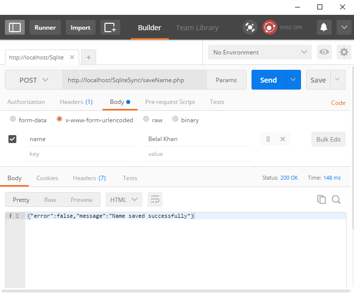 - Now its time to test the script we created. So in my case the URL is http://localhost/SqliteSync/saveName.php